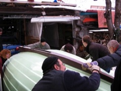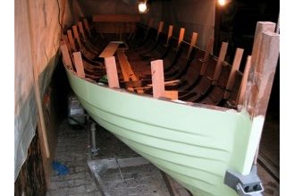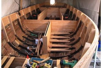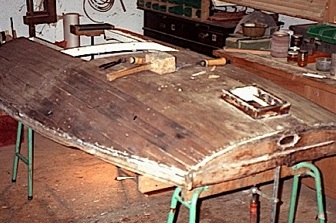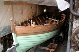 Nachdem der Rumpf außen fertig war, musste das Schiff gedreht werden. Nach vielen Überlegungen, mit welcher Vorrichtung das Boot wohl am besten zu drehen wäre, brachte uns ein Artikel im Woodenboat auf die naheliegendeste und einfachste Methode.