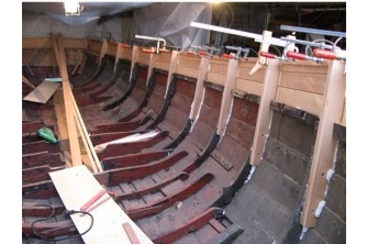 Ich verlängerte die Spanten und erhöhte den Rumpf um einen naturbelassenen Plankengang (zweilagiger Aufbau, ca. 30mm Stärke).